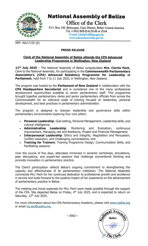 Press Release – Clerk of the National Assembly of Belize attends the CPA Advanced Leadership Programme in Wellington, New Zealand
