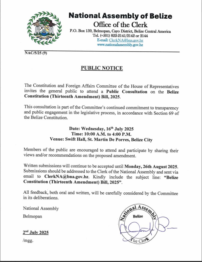 Public Notice – Public Consultation on the Belize Constitution (Thirteenth Amendment) Bill, 2025