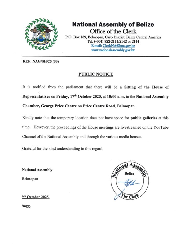 PUBLIC NOTICE: House of Representatives to meet on Friday October 17th, 2025