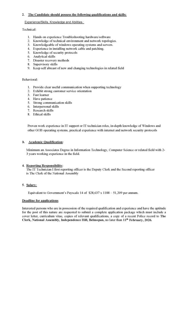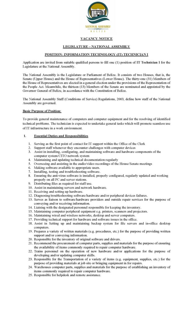 VACANCY – INFORMATION TECHNOLOGY (IT) TECHNICIAN I